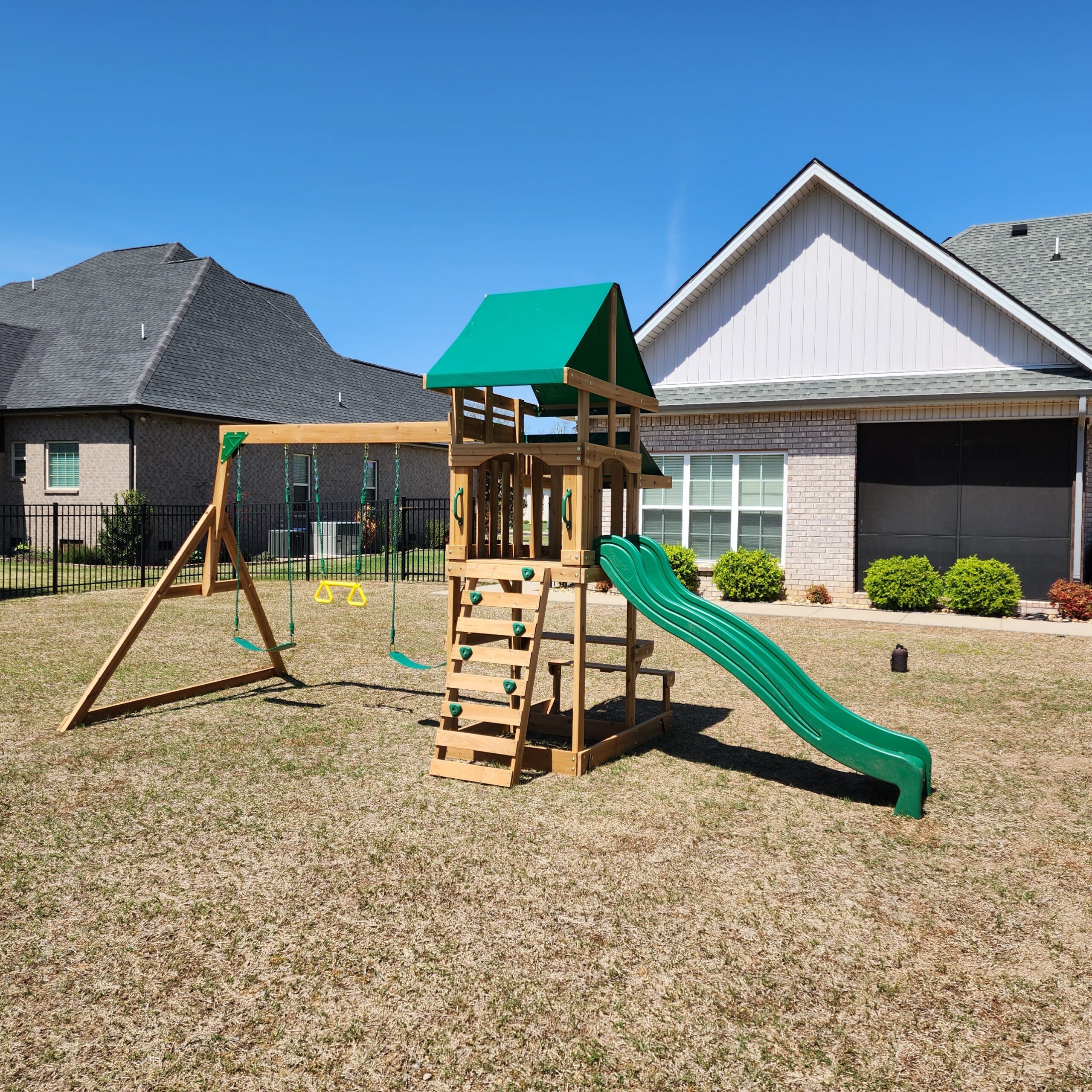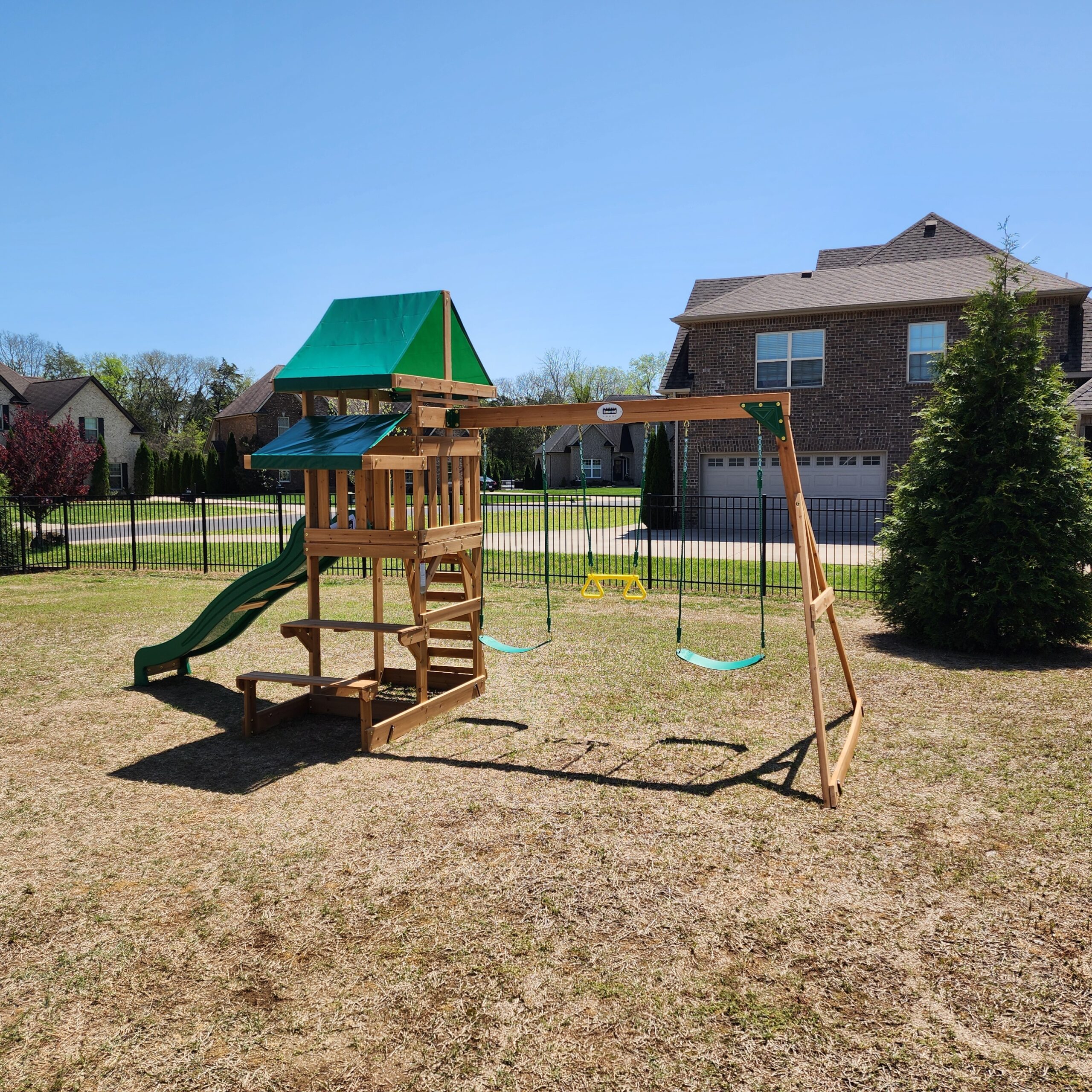 Provide kids with a fun way to get physical activity and exercise with this Backyard Discovery Belmont Cedar Wooden Swing Set. The Belmont’s frame is constructed of eco-friendly, sustainable cedar wood that comes factory-stained with a rich color that adds to its visual appeal. This Backyard Discovery Belmont swing set features a fully covered play deck, an 8′ wave slide, two belt-swings with kid-friendly chains and an incredibly fun trapeze acrobat bar. A sand box and a picnic/activity table with a bench are also attached for kids who want to rest, eat or play games. Additional features include a rock wall ladder that provides easy access to the top floor. Loads of fun for girls and boys, this Backyard Discovery swing set comes pre-drilled, pre-cut, pre-stained and includes stamped lumber for easy two-adult assembly. Built to the highest residential standards, your kids can enjoy the value of a personal outdoor playground right in their own backyard.