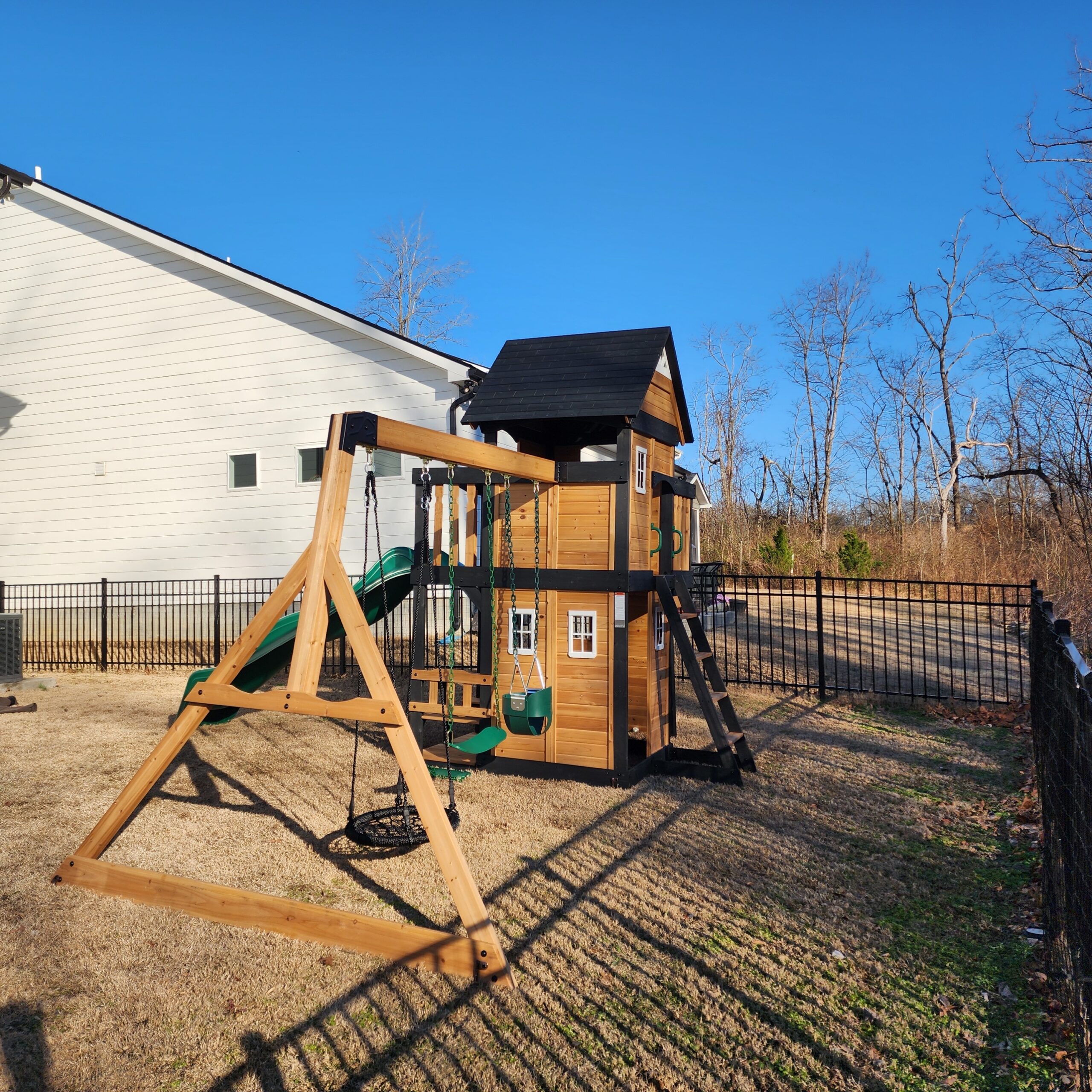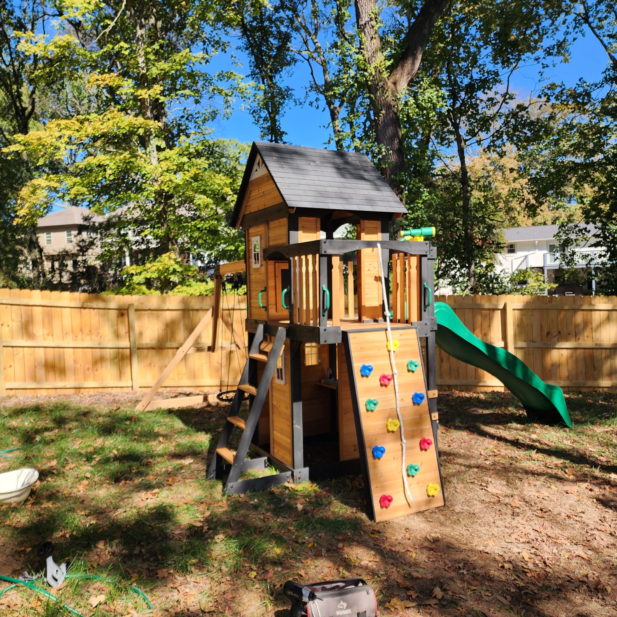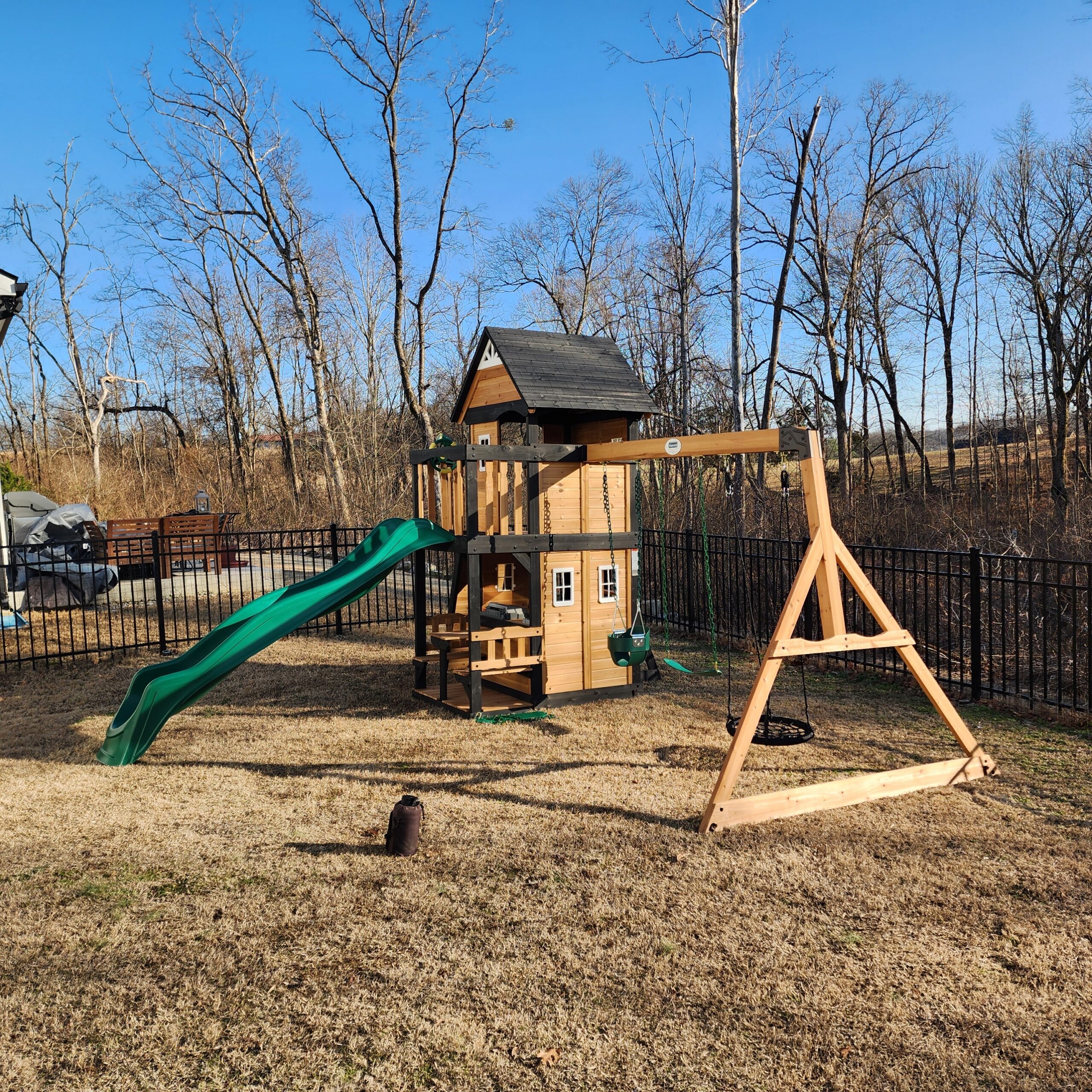 Your little adventure-seekers will feel very accomplished after playing on the Canyon Creek Wooden Swing Set. With practically a full playhouse below (complete with grill, plastic food, and a 4-person picnic area) and a full clubhouse on top with its own telescope and steering wheel, you may not even notice the swings on this swing set! The challenging rock climbing wall and standard ladder give everyone a quick, safe, fun way to scramble to the spacious top clubhouse, balcony and sun deck. The slide zips them right back down to their snack area, belt swings and web swing.