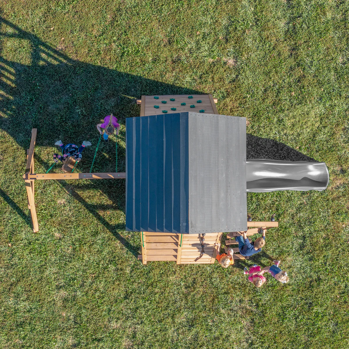 • Climbing Rope Ladder: 9-foot-tall rope ladder with wooden rungs offers adventurous climbing fun, leading to a victory bell to celebrate the summit
