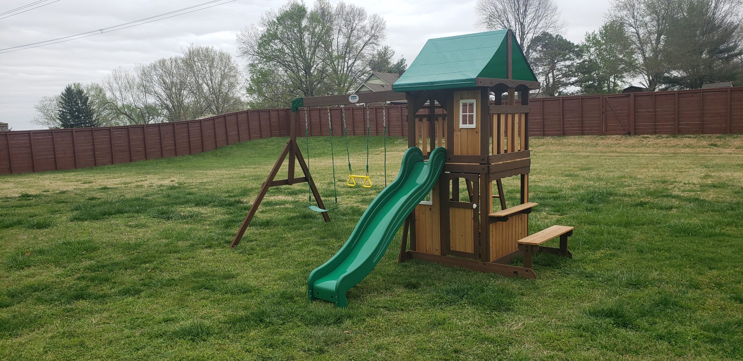The Lakewood has some really neat features that make it great for smaller yards but keep the kids playing all day long. First, the raised fort has a colorful awning and front wall with white trimmed window to make a cool clubhouse-like area up top. Down below there is another fort, with a front wall, window, and real door! And the side snack window has built-in bench just outside. Out on the swing beam there are two belt swings and an acrobat bar for plenty of swinging and clowning around. A standard step ladder gets the kids to the upper fort and their 8′ speedy slide zips them back down again.