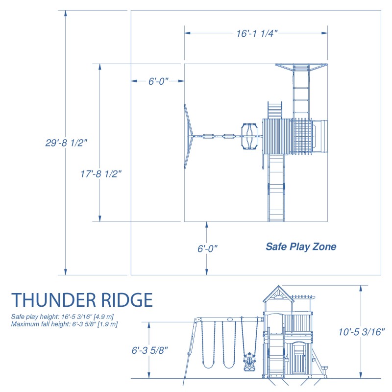 The Thunder Ridge lives up to its name! It’s a big set with tons of fun things to do. Start with an upper fort that has a wood roof and for extra play space, a side porch with sunny pergola top. The lower fort has a front wall with large chat window and real door. The side wall has a snack window and built-in bench just outside. Out back there are monkey bars that make getting to the upper fort a hand-over-hand challenge plus a step ladder. For hours of swinging fun there are two belt swings and a two-person ship’s wheel glider. And our 10′ speedy slide safely zips the kids back down to the yard.