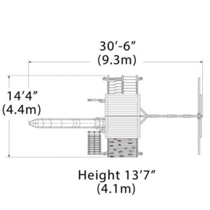 Playset shown with: • Titan Peak XL • Wood Roof • 2 – Gable Kits • 3 Position 10′ Swing Beam • Steel Reinforced Swing Beam Kit • 3 – Belt Swings • 14′ Rocket Slide • Accessory Arm with Rope Ladder • Accessory Arm with Trapeze