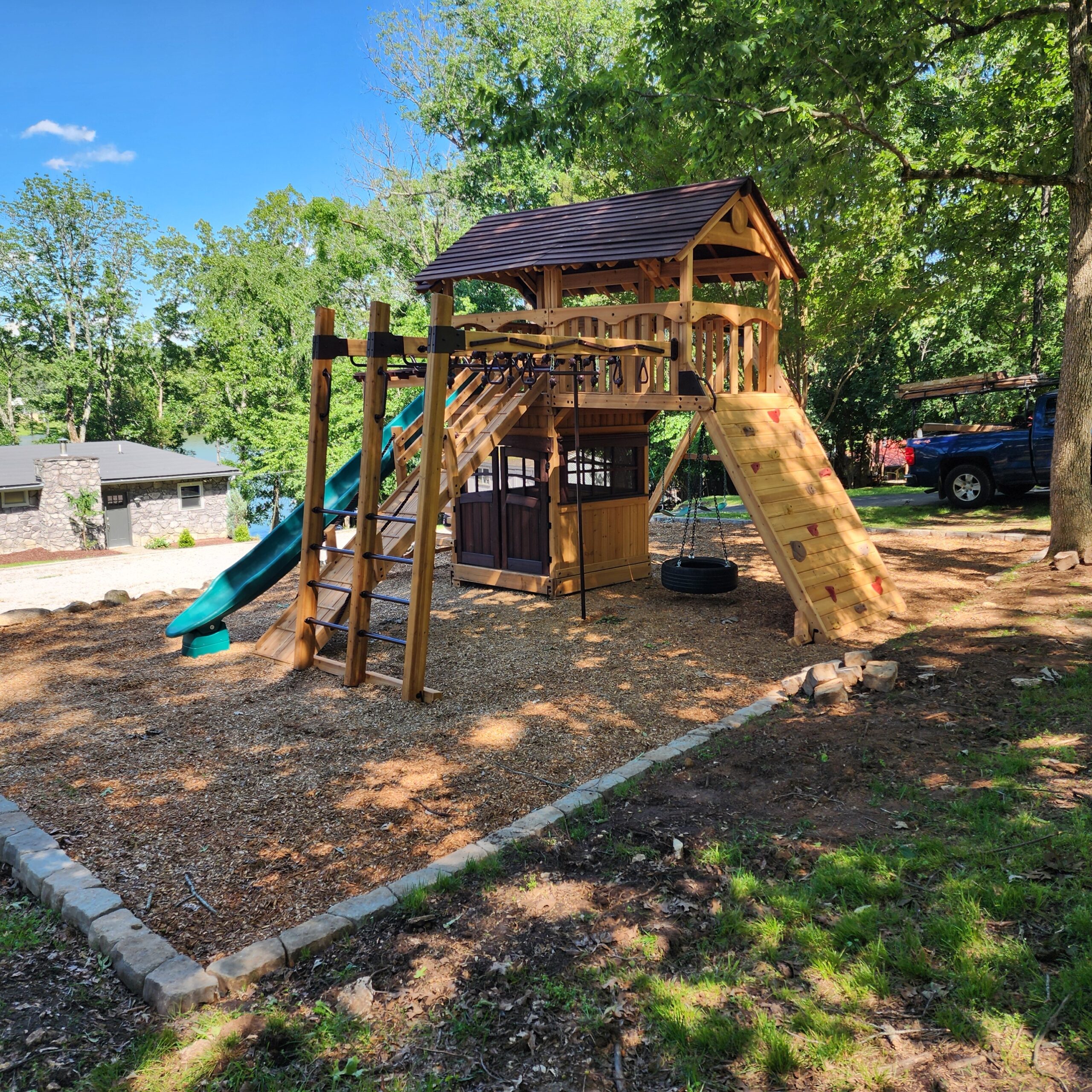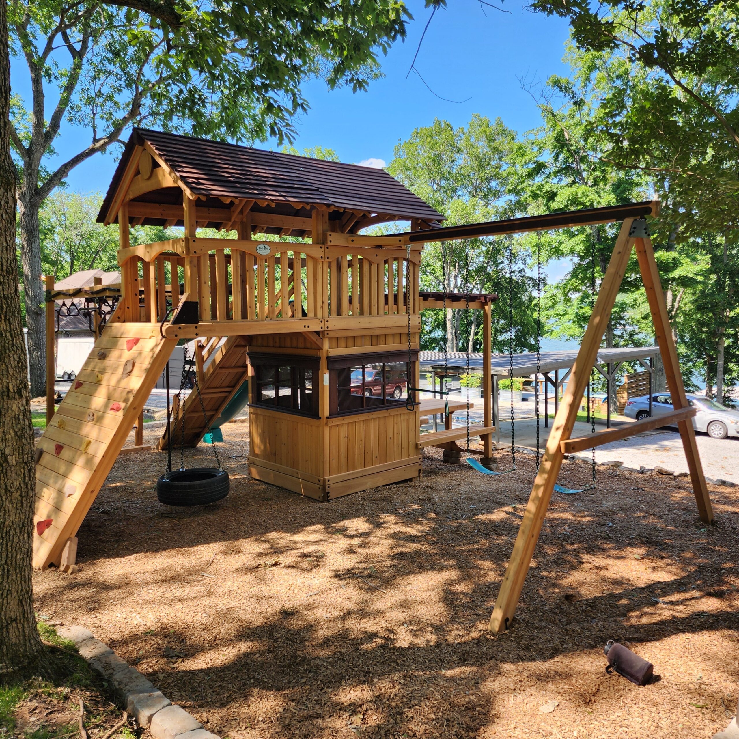 The fort structure has a 7′ high deck and a lower playhouse with 90 sq. ft. of play space.
